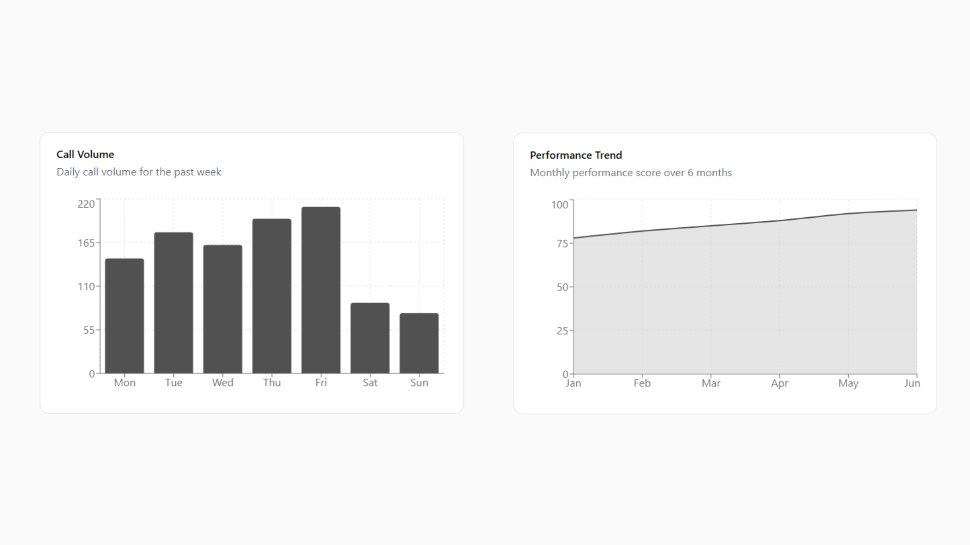 An intuitive dashboard provides real-time insights into call volumes, performance scores, and agent activity.
